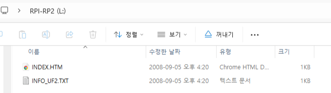 아래와 같이 드라이브 이름이 RPI-RP2로 나타나고 이 드라이브에 다운로드 받은 CircuitPython 파일을 복사해넣는다.