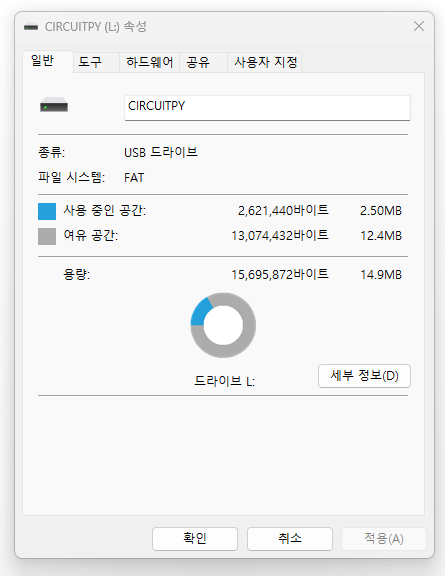 또한 드라이브의 속성을 보면 이름도 CIRCUITPY로 바뀌었고 용량도 14.9MB로 나온다.